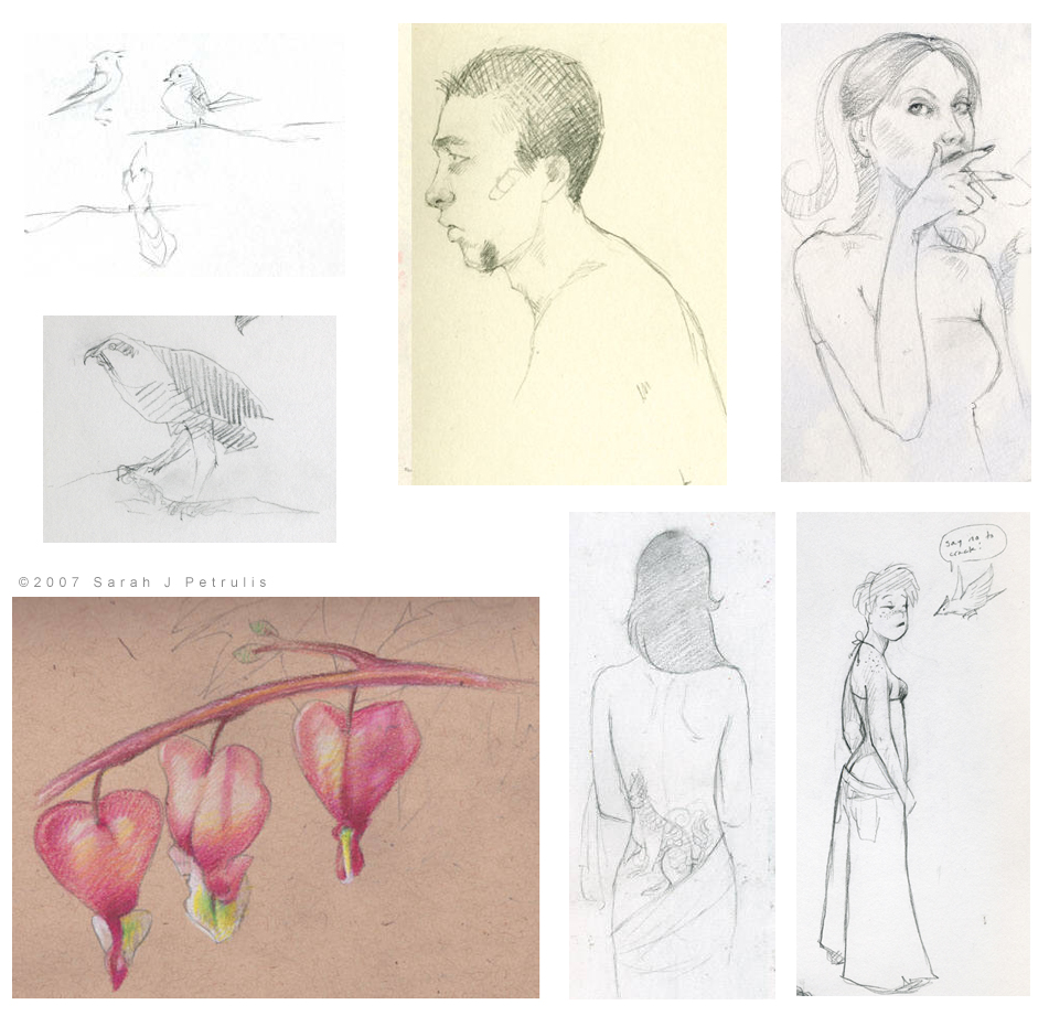 More of the zillion little birds I drew that year, Alex and Fara, some bleeding heart flowers, Chris's kirin tattoo, and THE FUNNIEST JOKE OF ALL TIME e_e.
