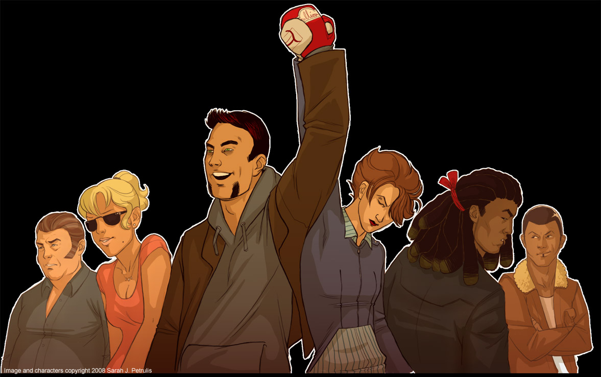 A graphic I made for my characters page. Featuring Kennedy, Benita, Alex, Jackal, Angelo, and Massimo.