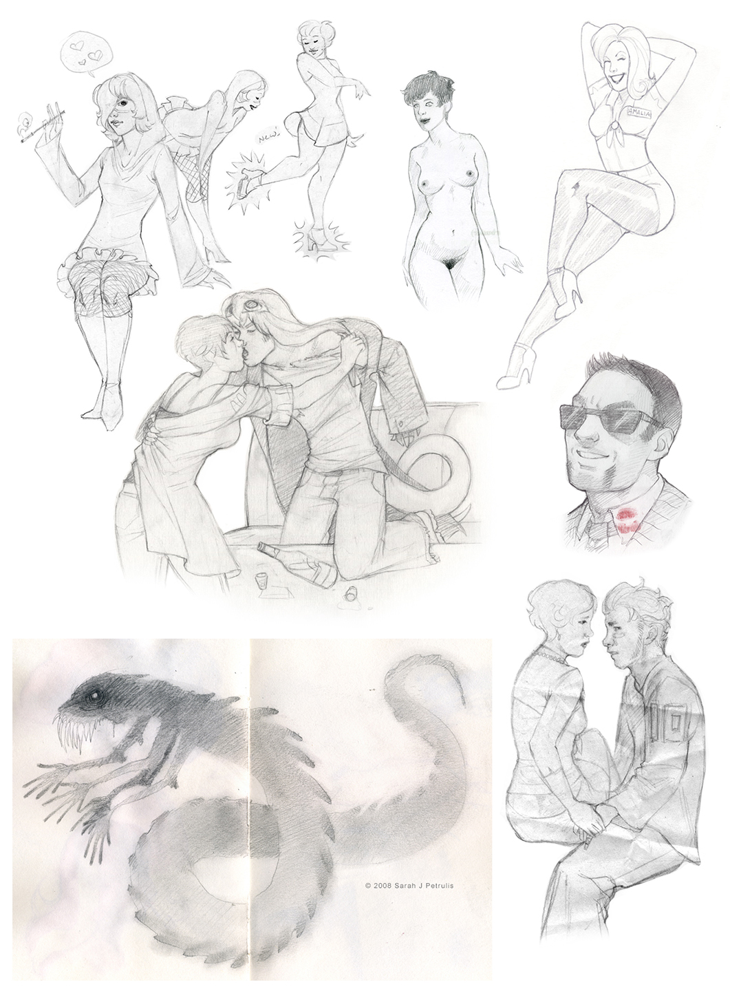 One of Preston's characters, Benita with new shoes, AU Rita and Amalia pin ups, Jackal making out with Nuncio over drinks, Alex being a twat, a demon, and Benita and Harvey having a sad time.
