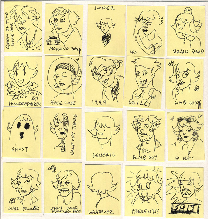 Some off the cuff self portraits I did one day when I had a bunch of free time and a pad of little sticky notes. They make me laugh so I'm putting them up.