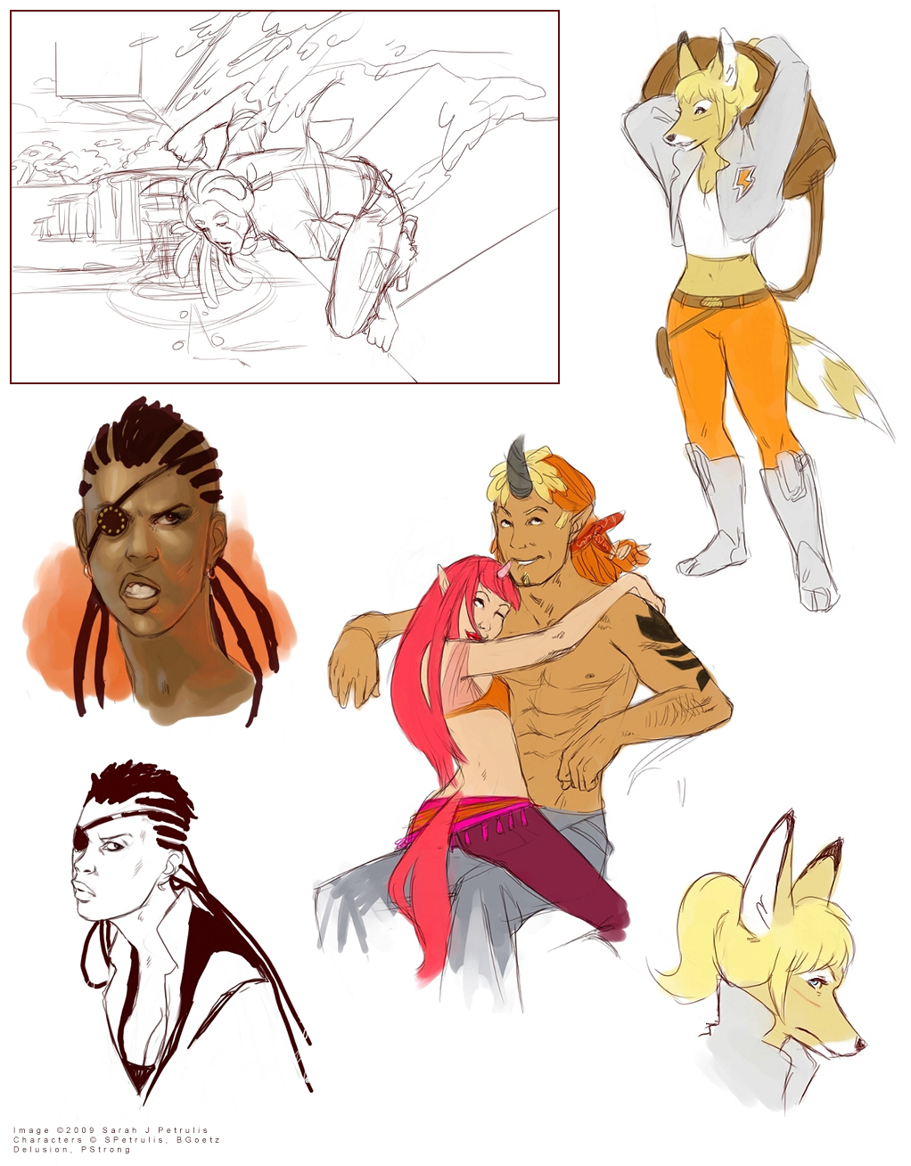 Nore spying on Dehj's mansion, Grinn with some intense space boots, a cool eyepatch lady I don't remember anything about sadly, Orange and Brianne's character who were in looove, and a pouty Grinn head.