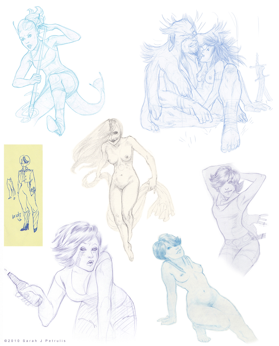 Baby action pose, some random barbarians in love, a Dehj outfit doodle I thought was cute (reminds me of The Little prince a bit), a random ghosty Bleach inspired gal, two drunk Ritas, and a Harrah pin up.