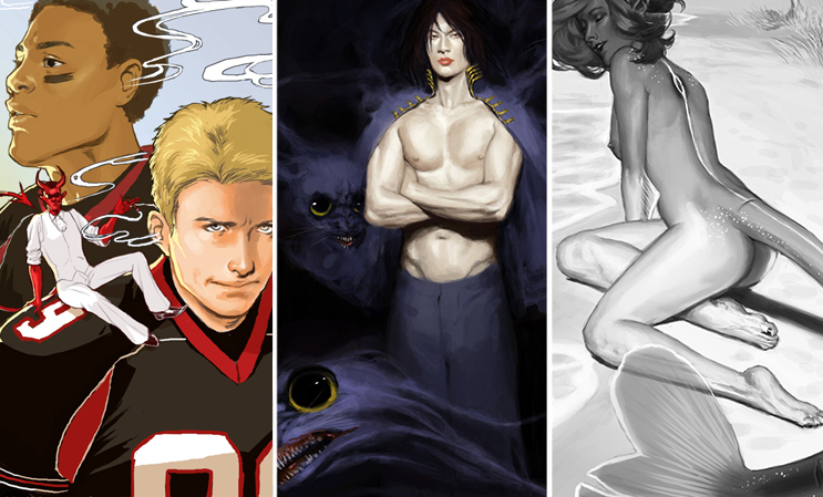I started working on finishing my BFA finally and my first semester was spent mostly studying (go figure) and working on a couple of professional gigs. I did get very into doodling in my notebook which made me get a lot more accurate at drawing in pen/in general so not all was lost. I was feeling burnt out on art forums and there wasn't really any other substantial online communities to take their place since most people had switched to Tumblr and other more modern platforms where communication wasn't as much of a factor. So while I did a few trades here and there most of the stuff I was working on for fun was either my original work or commissions. My interest in Japanese history and in particular stories about samurai was at an all-time high and I was really influenced by that and looking at woodblock prints by artists like Kikuchi Yosai and Utagawa Kuniyoshi.