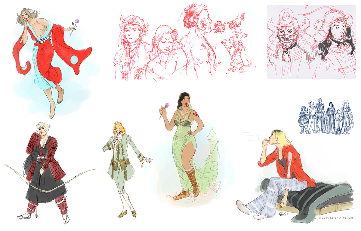 Wanisse with a flower (for you!), a notebook doodle of Ex, Wanisse, Takahiro, and Ed Kin, another notebook doodle of some characters from my historical fiction comic start, Ex as an archer?, Wanisse as a fop, Tadaka with a flower (also for you!!), Roman shmokin, and a height chart/police lineup of my historical fiction characters.