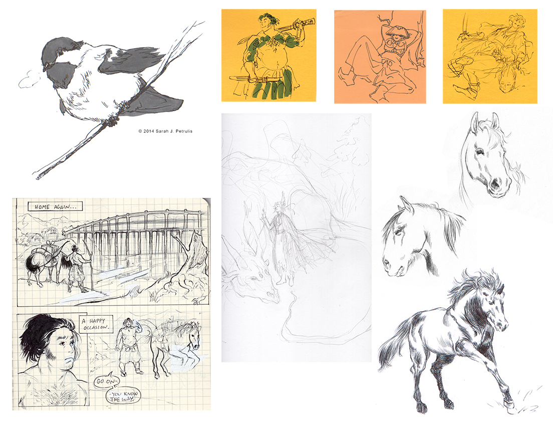 Some animals, sticky note doodles of the historical fiction characters, an attempt at re-starting said hf comic, and Ex as a generic fantasy lady with a dragon (bleh).