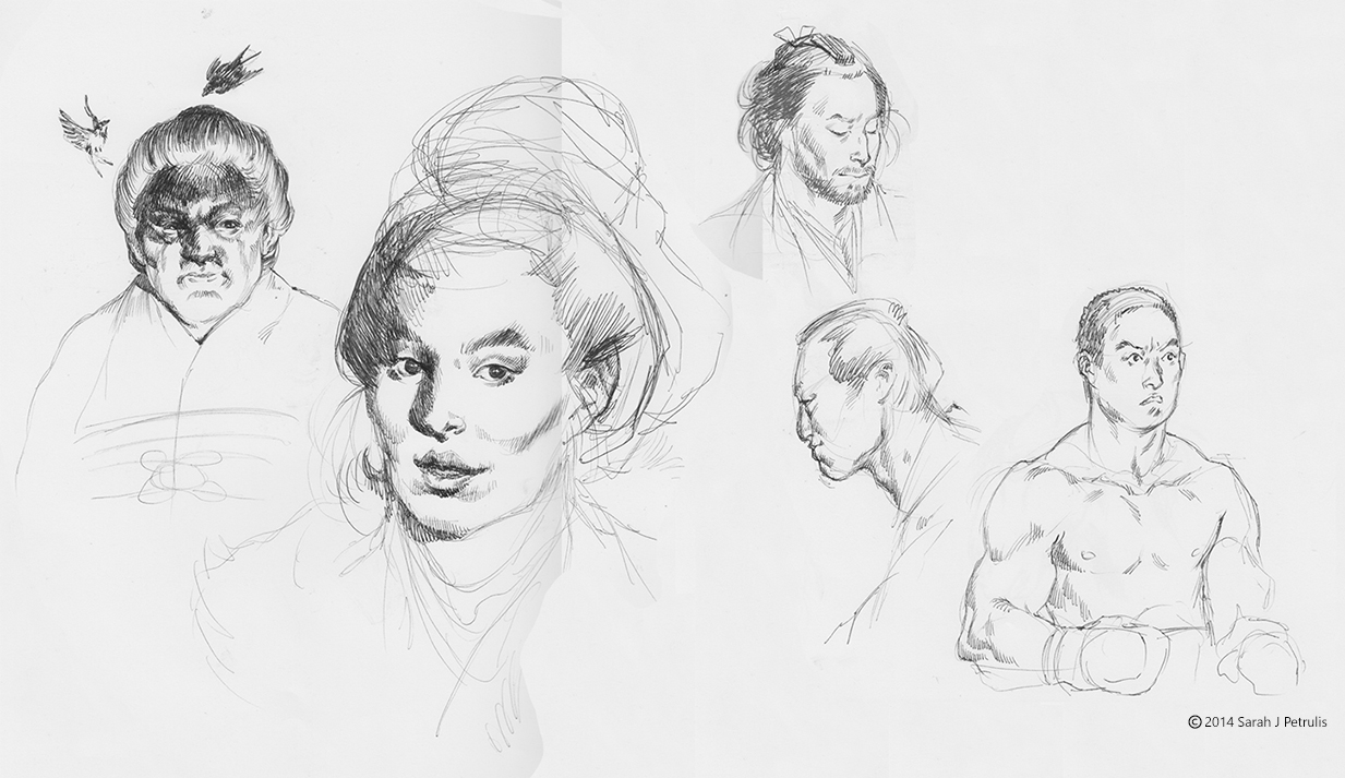 Some doodles of the characters in my samurai story and a random pissed off boxer guy.